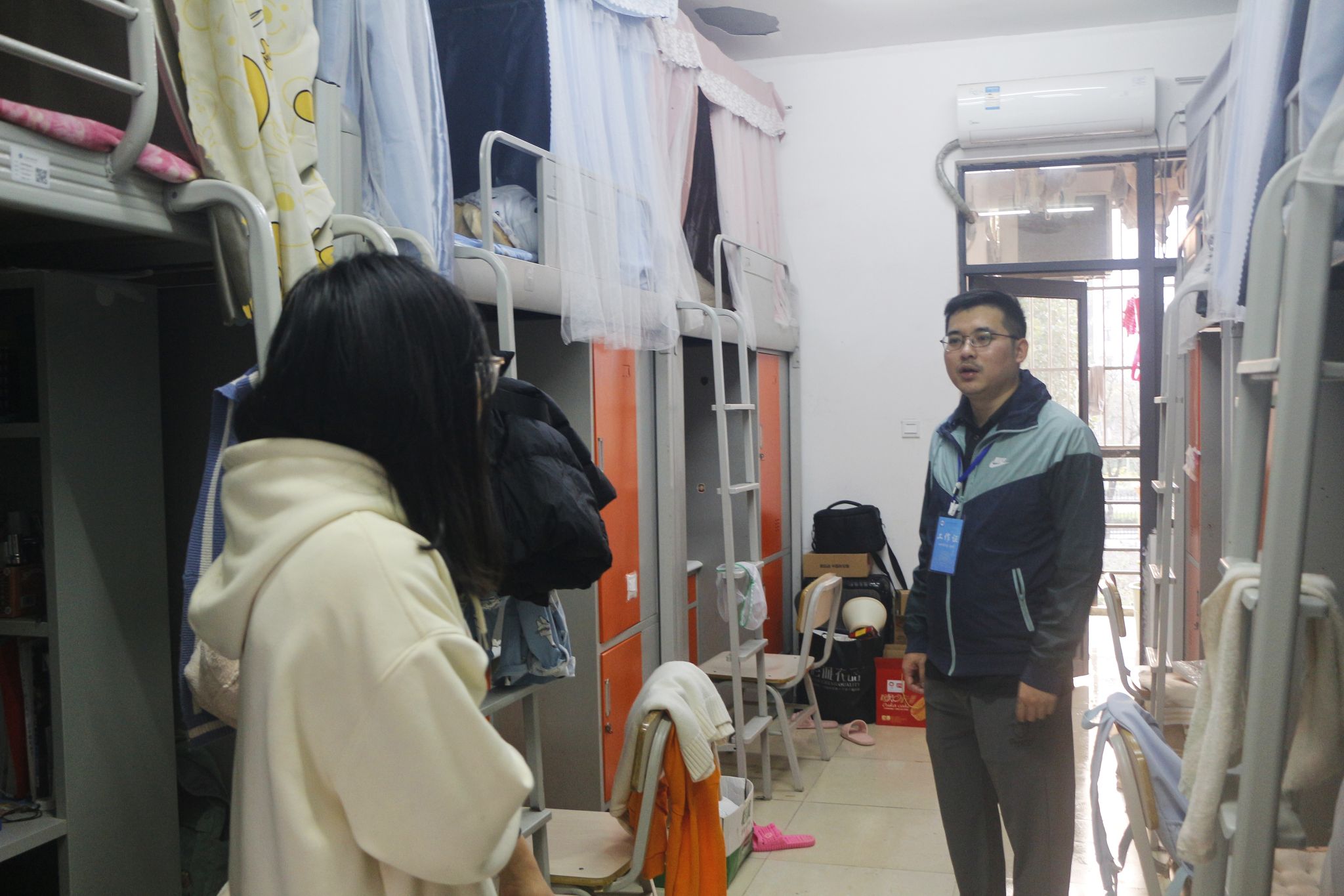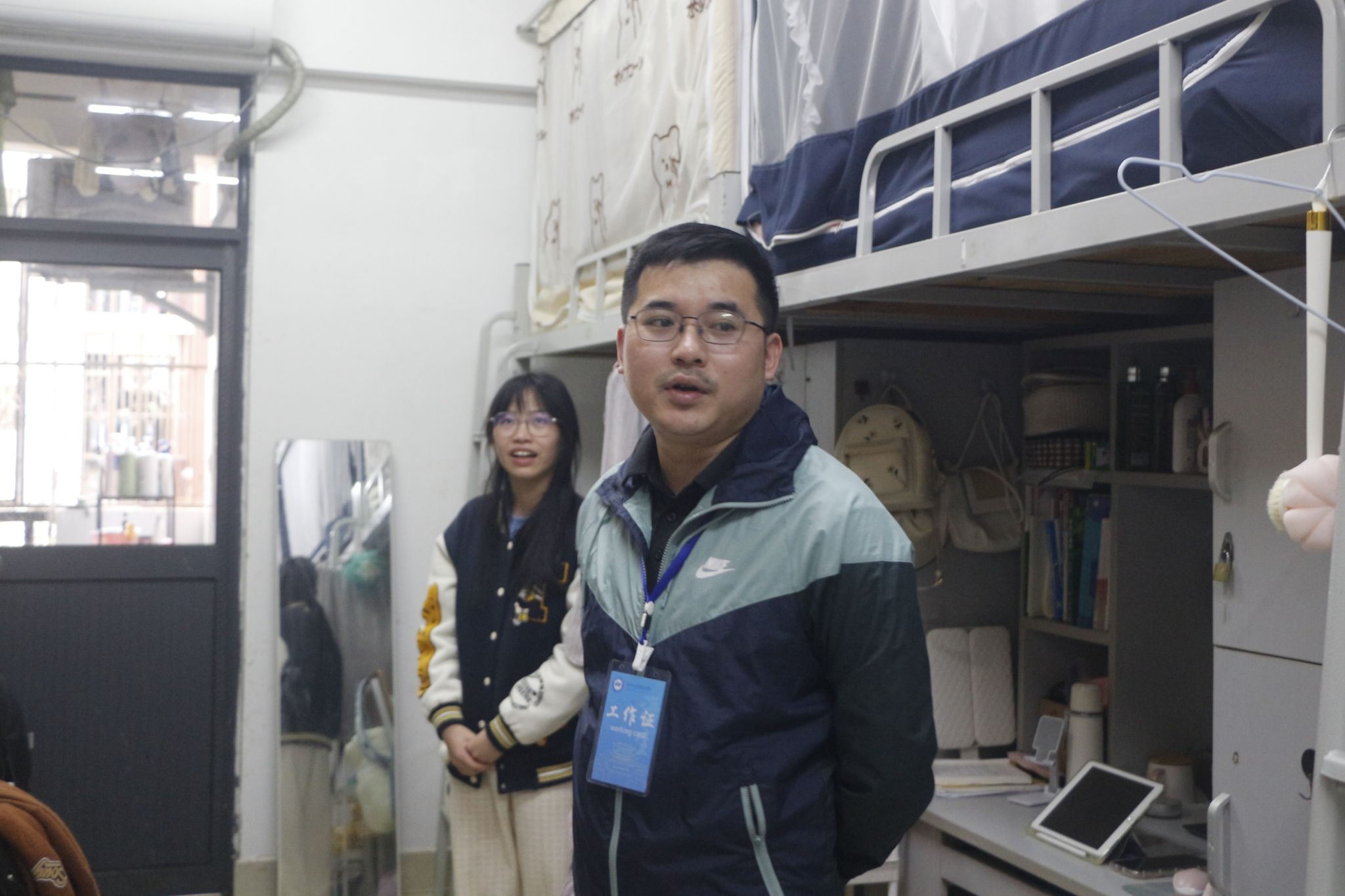 林南新重点检查了学生宿舍的卫生及用电安全,与同学们交流如何做好卫生死角的清洁工作,叮嘱同学们注意保暖防潮,开窗通风,并提醒个别宿舍整改存在的卫生问题。通过检查,大部分同学都注重维护宿舍卫生和宿舍安全,严格遵守宿舍安全规范,共同建设整洁、宜居的宿舍环境。林南新表示,我们要时刻保证宿舍的干净整洁,遵守校纪校规,坚决抵制违规使用大功率电器的行为,始终紧绷宿舍安全这根弦。