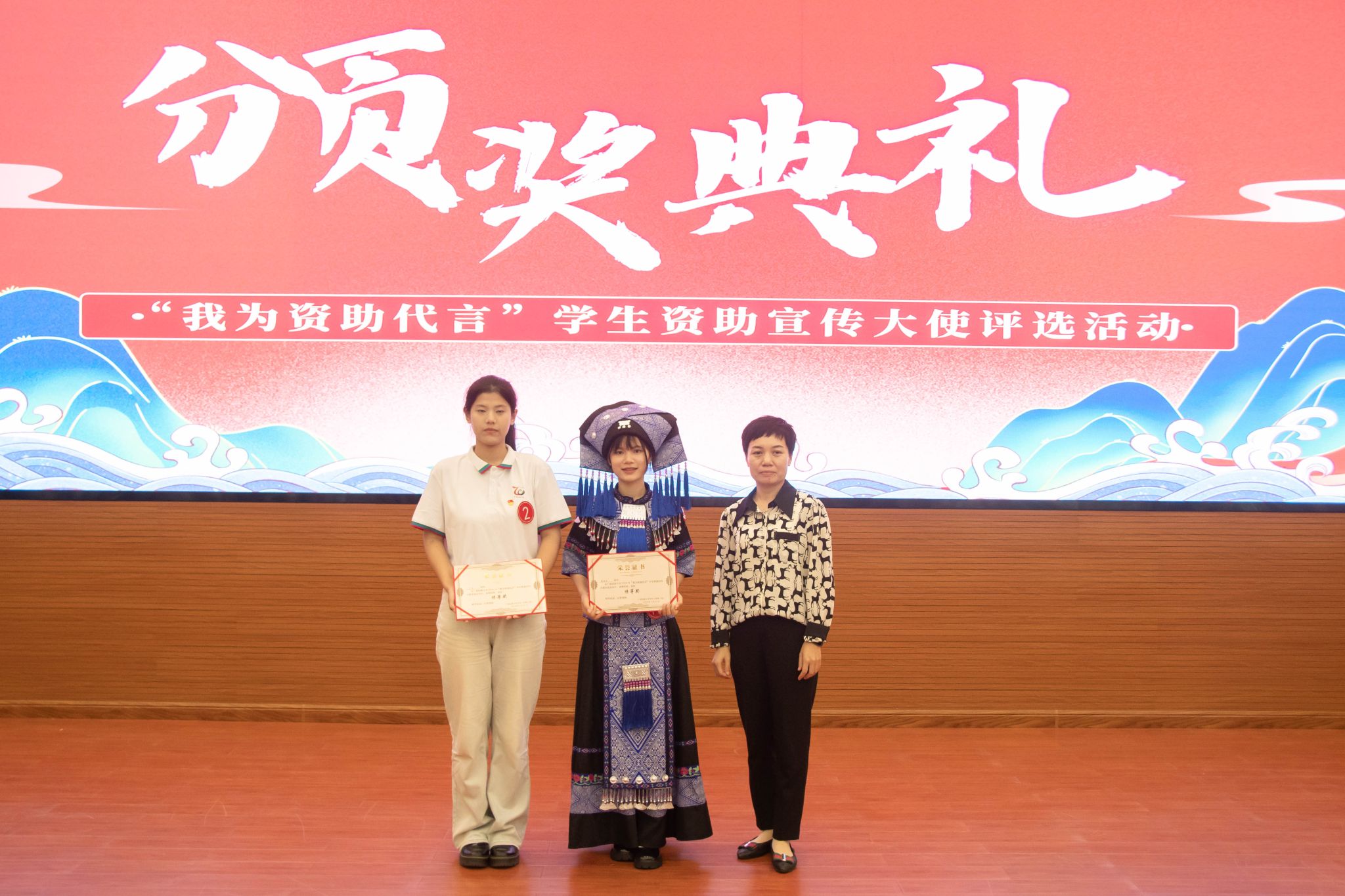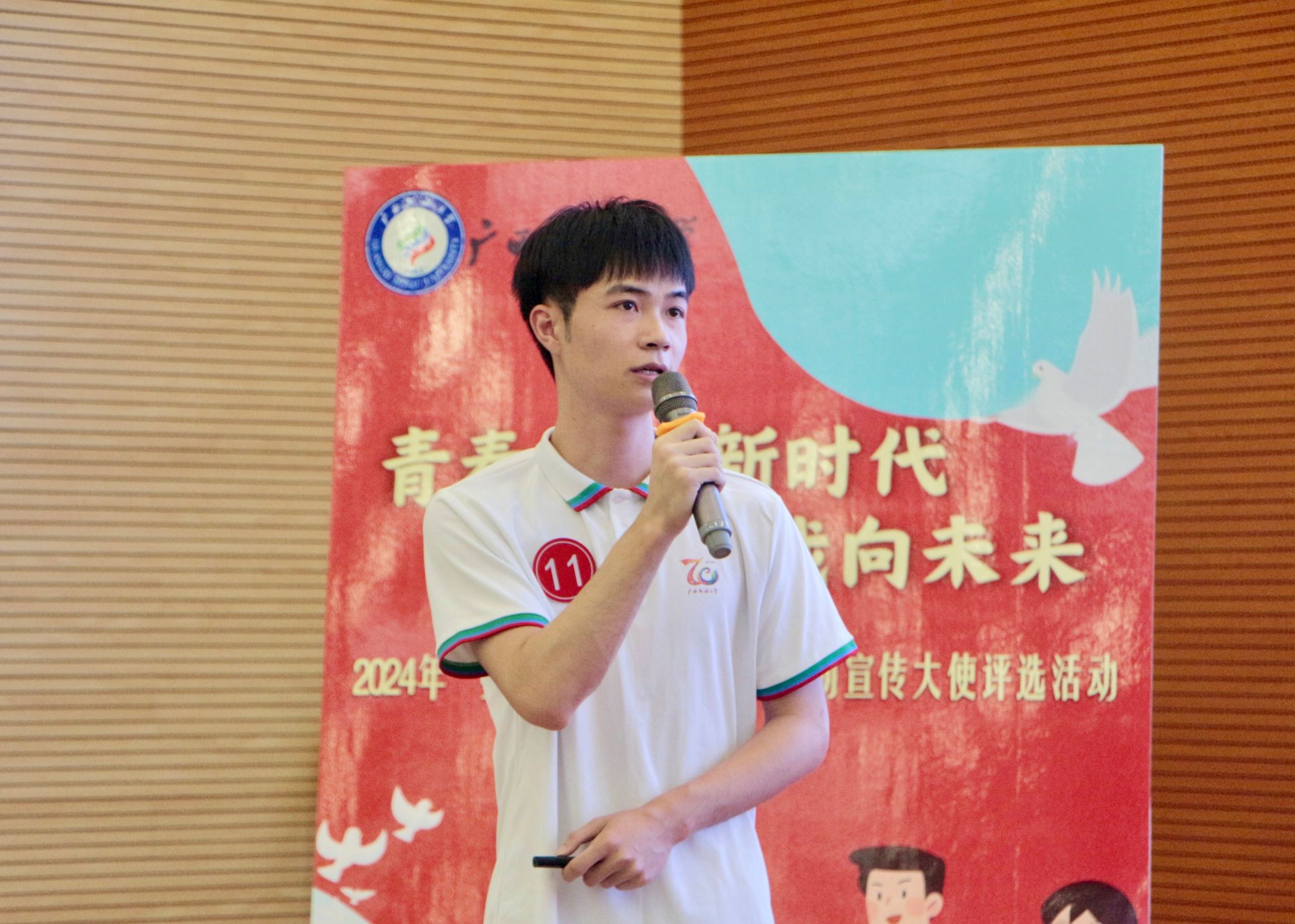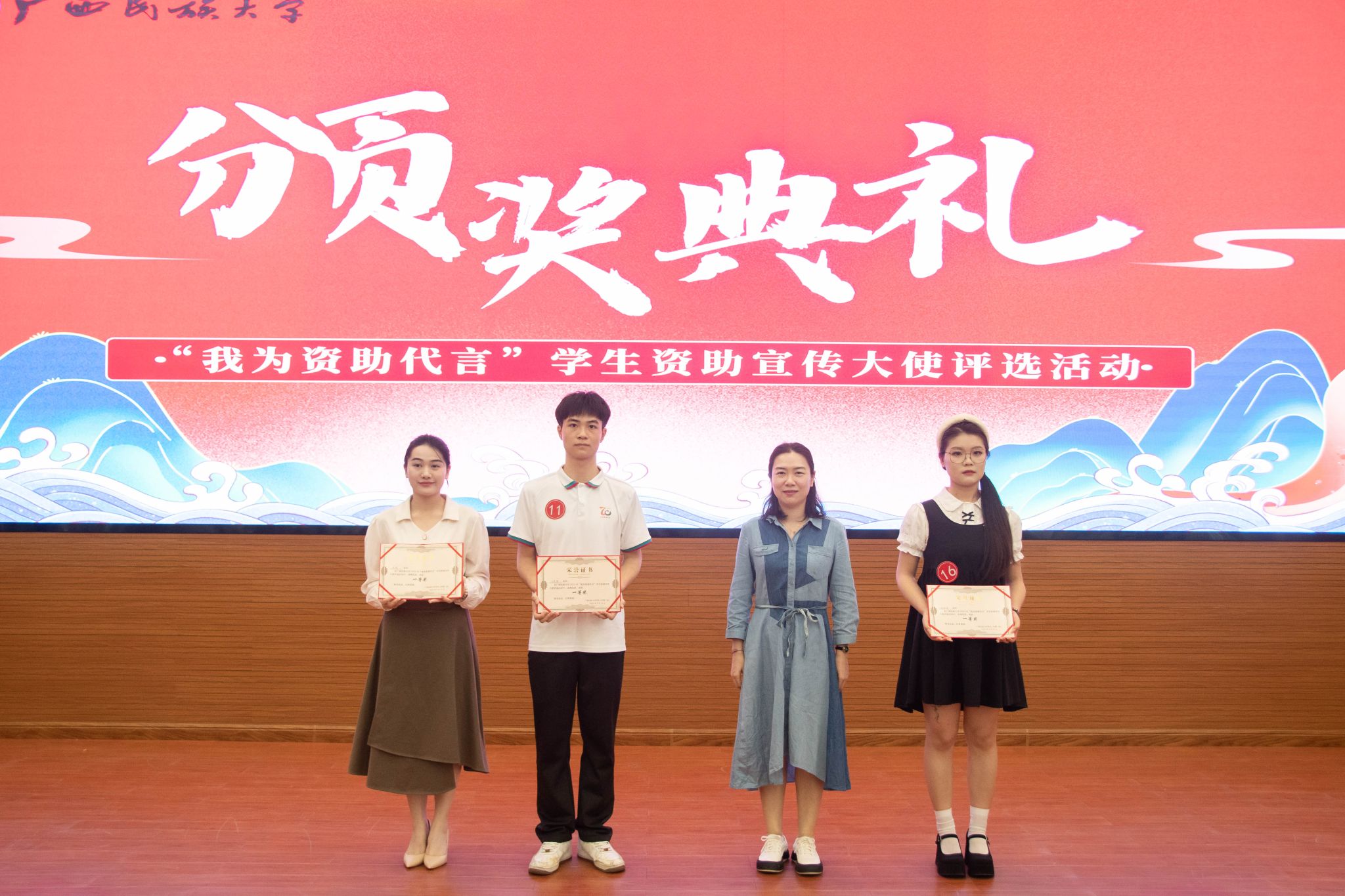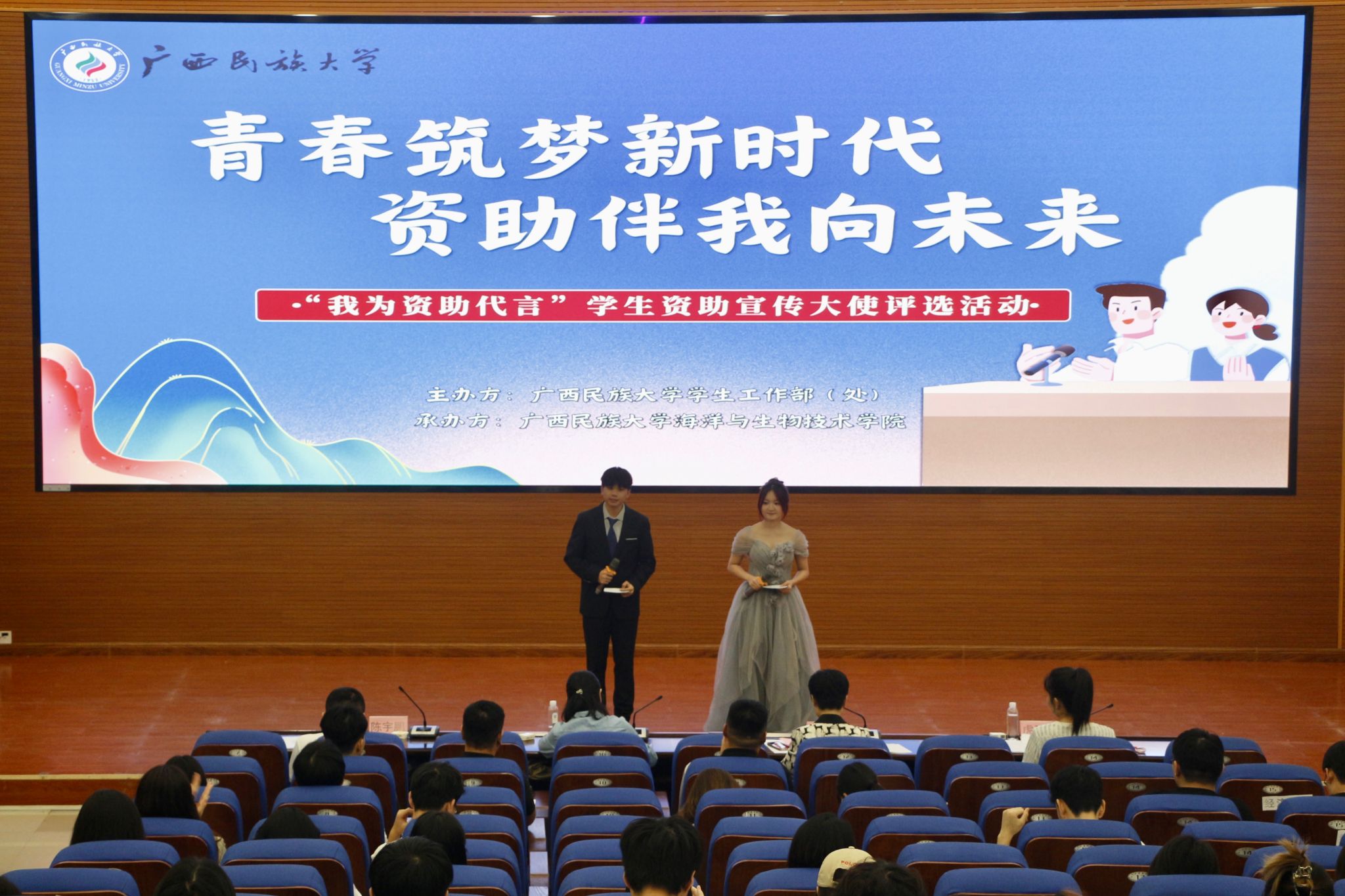 5月21日下午,我院于明德楼101报告厅承办广西民族大学2024年“我为资助代言”学生资助宣传大使评选活动。学校党委学生工作部(处)副部(处)长韩燕燕、研究生院思想教育科科长李斯琴、校团委宣传部副部长陈宇鹏、党校办秘书科副科长虎亚威担任评委,来自不同学院的21名选手参赛,各学院学生代表共同观看。
