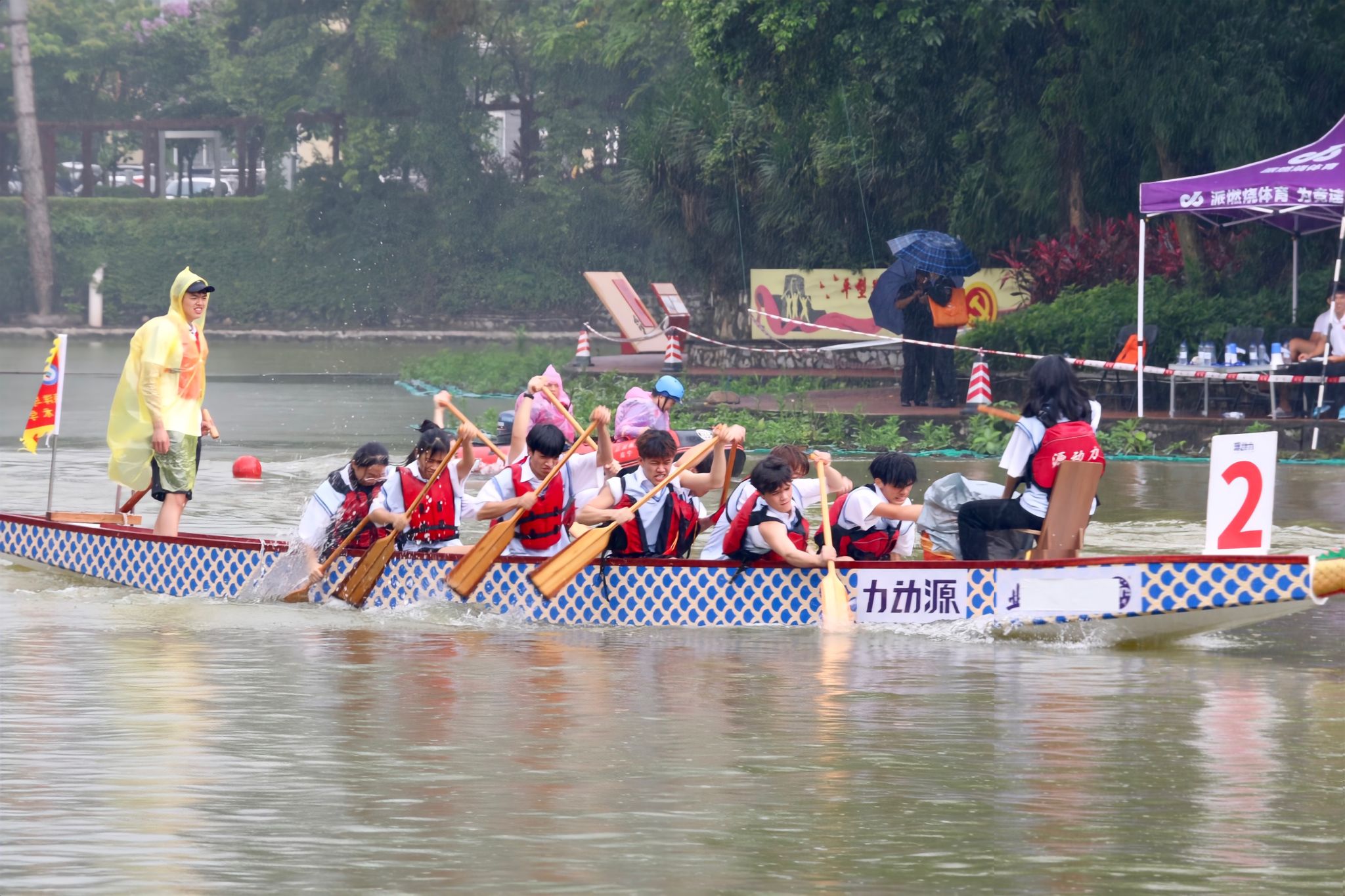 现场气氛火热,岸边观众喝彩齐鸣,经历了前期紧张备战训练,我院参赛队员摩拳擦掌、跃跃欲试。随着比赛号角响起,舵手稳坐船尾,精准操控方向;鼓手敲击着节奏明快的鼓点,激励着队友们奋力前行;划手们齐心协力,伴随着整齐划一的口号声,全力以赴地划桨,使龙舟在水面上迅速前进。临近终点,比赛进入了白热化的阶段,鼓点更加紧密,队员们划桨的速度也更加迅速。最终,我院龙舟队顺利冲过终点,荣获精神文明奖。