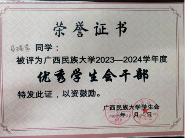 马瑞茜同学自入学以来就积极参加学院的各项实践活动。曾任学院学生会学生干部一职,通过自身努力从理事、到部长、再到团委副书记兼执行主席。除此之外,她还兼任了班级学习委员。在她多次参与组织策划学院中的各项活动达15项以上。在任职期间,她曾获得校级优秀学生会理事,连续两年获得校级优秀学生会干部以及院级优秀工作者称号,以勤勉进取的工作态度全方位充实锻炼自己。