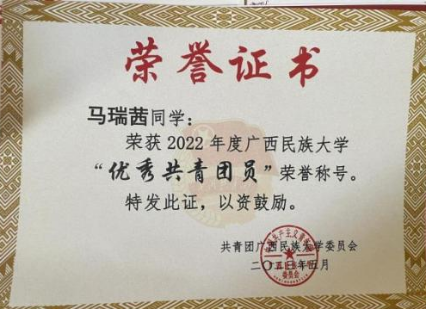 马瑞茜同学在思想上积极向党组织靠拢,始终以党员的标准严格自律。她勤奋学习党的理论知识,不断提升自身的政治觉悟。她曾获得广西民族大学“优秀共青团员”的荣誉称号。通过持续不懈的努力,她在大三学年成为了一名中共预备党员。在2024年4月代表学校参加全区高校大学生新党员培训班,并顺利结业。