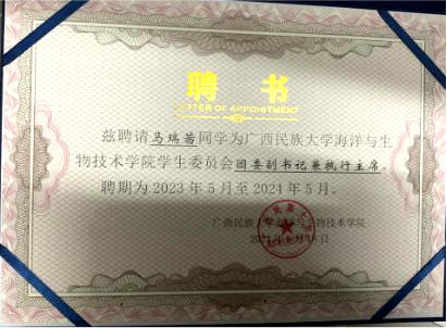 马瑞茜同学学习态度端正,刻苦努力。在入学以来,一直保持学年专业课成绩与综测成绩排名专业前三,并且多次获得优秀学生特等奖学金和三好学生等荣誉。在夯实专业基础的同时,她也积极探索,与时俱进。在科研上,大三学年作为主要参与者,成功获得国家发明专利《一株哈尔滨乳杆菌及其在酸粥发酵中的应用》。与此同时,她也积极参加学科专业竞赛,获得广西生物科学与生物工程类大学生创意竞赛二等奖等4项自治区级奖项,做到了将专业知识与实践相结合。
