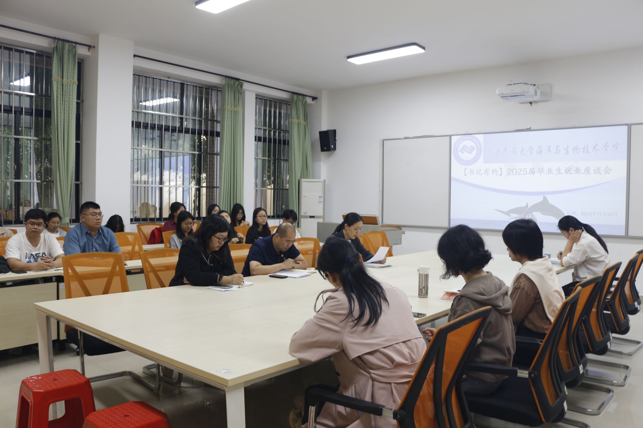 为全面了解我院2025届毕业生的求职进展,帮助毕业生们解决在就业工作中遇到的困难,进一步推动毕业生尽早就业,11月20日下午,我院于明德楼123会议室召开“书记有约”2025届毕业生就业座谈会,学院党委书记刘红全,党委副书记门媛媛,副院长张琴,2025届毕业班班主任及毕业生代表参加此次座谈会。