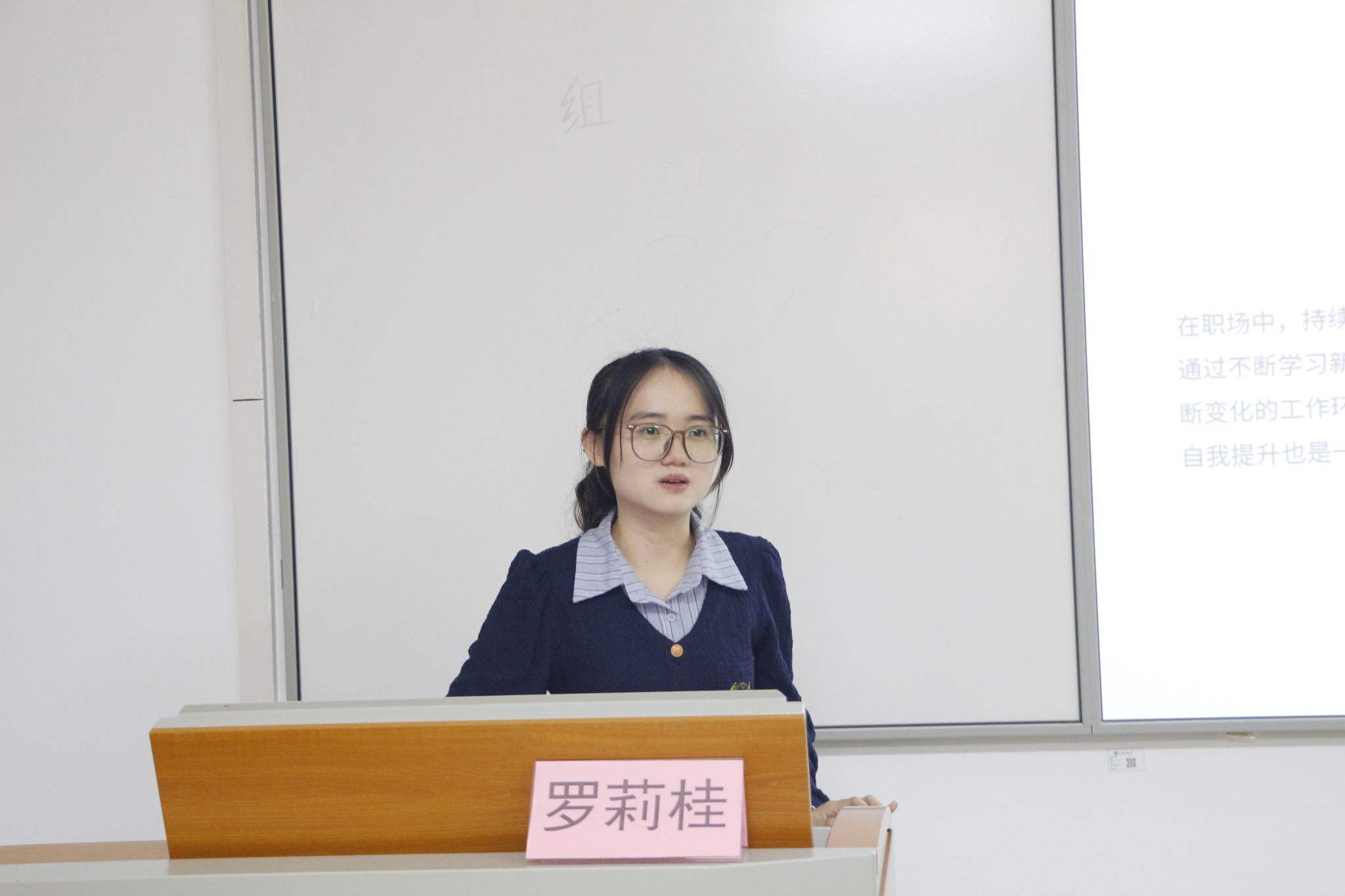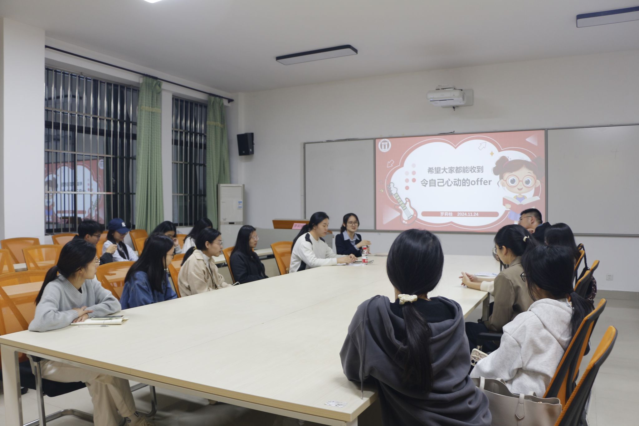会上,罗莉桂首先从招聘信息的获取、简历制作、面试准备以及说课内容等方面出发,为同学们进行了细致入微的分析与讲解。随后,她通过自身求职经历,向同学们倾囊相授求职策略,引导同学们多维度挖掘岗位信息,持续锤炼自身专业素养,精研面试技巧,积极参加双选会。同时,她希望同学们要在求职路上坚定自信,勇往直前。在互动环节,现场气氛热烈,同学们积极提问,罗莉桂针对同学们关于笔试内容、无生讲课与面试技巧等方面的困惑,给予耐心解答,为同学们提供极具价值的建议和精准的指导,帮助同学们在求职之路上披荆斩棘。