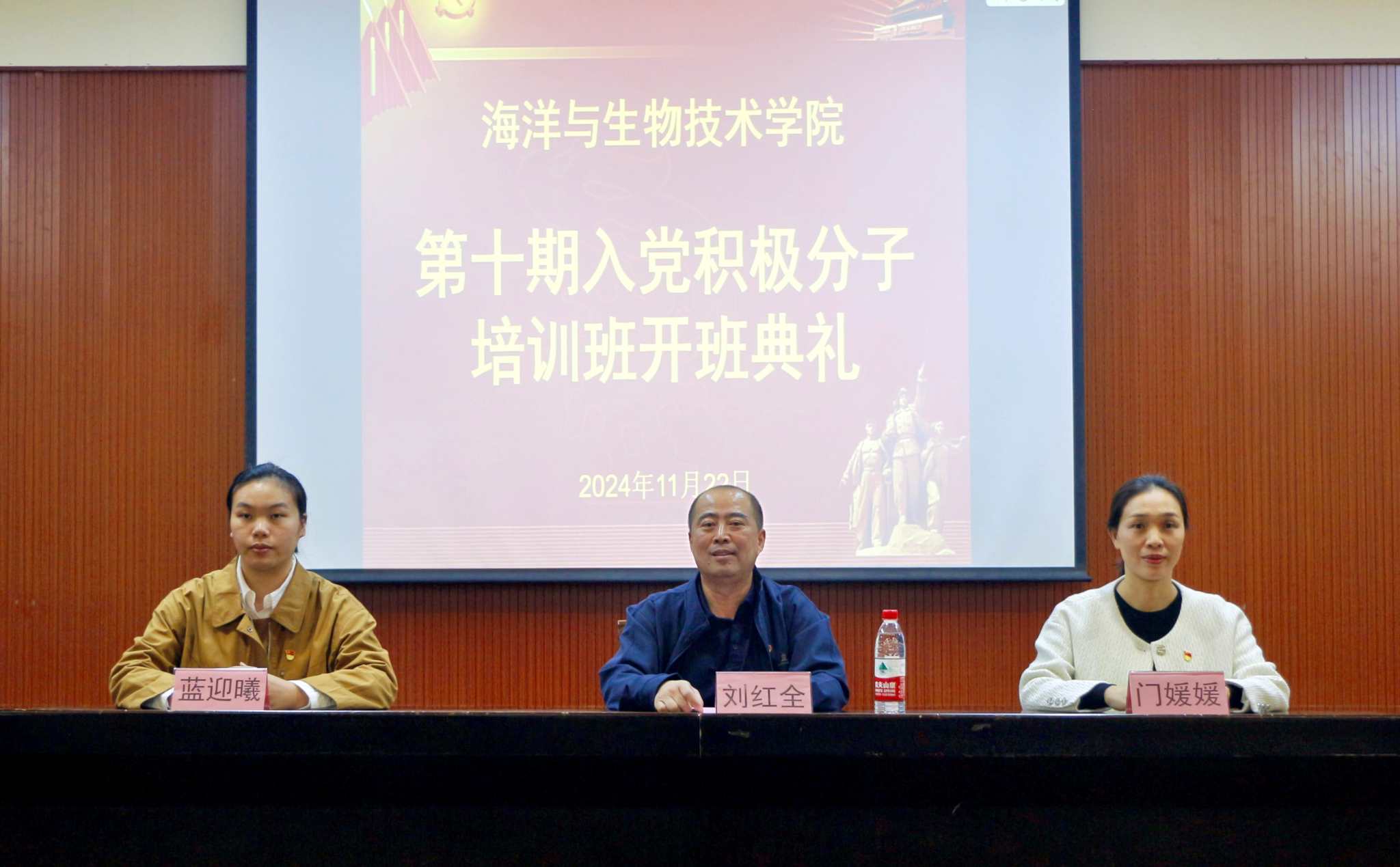 为加强对入党积极分子的培养教育,把好党员发展“入口关”和“质量关”,11月22日晚,我院于扬帆楼135报告厅举行第十期入党积极分子培训班开班典礼。学院党委书记刘红全,党委副书记门媛媛,学院党务秘书/本科生第二支部书记蓝迎曦出席本次开班典礼,第十期入党积极分子培训班全体学员参加,典礼由门媛媛主持。