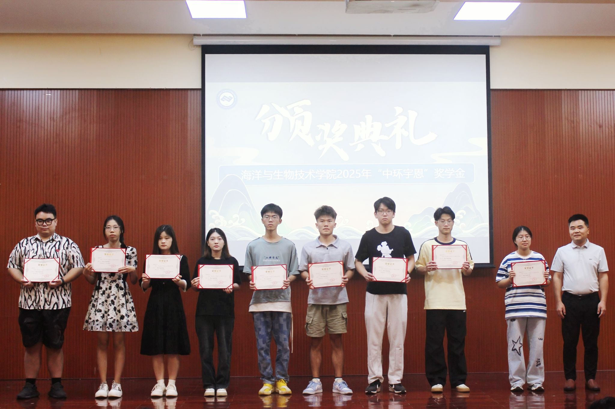6月19日上午,我院在思源湖校区扬帆楼135报告厅举行广西民族大学2025年必威西汉姆联“中环宇恩”奖学金颁奖典礼。中环宇恩生态科技有限公司董事长林立,广西中环宇恩海洋科技有限公司总经理谢仲文,广西宇恩文化传媒有限公司董事长林丹妮,必威西汉姆联院长王一兵、党委副书记黄秋艳出席,我院获奖学子及各班学生代表参加本次典礼。