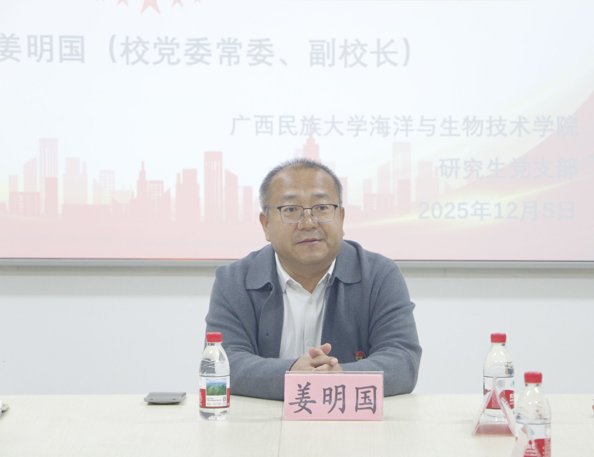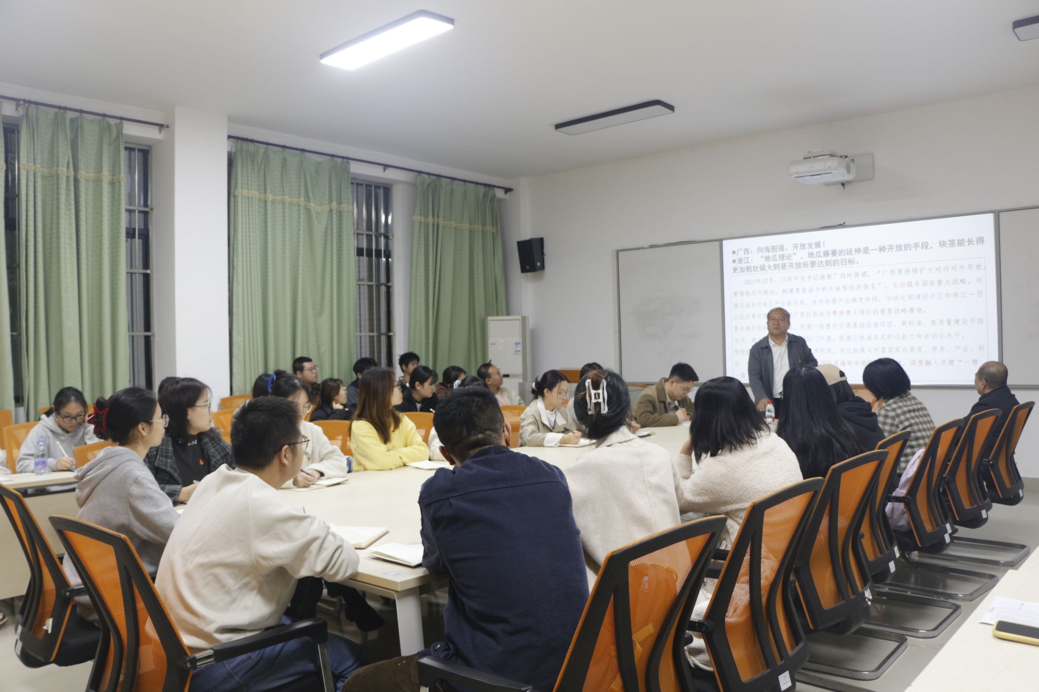 授课中,姜明国老师结合学校发展定位与广西区域优势展开阐述。他表示,广西民族大学始终以习近平新时代中国特色社会主义思想为指引,深入落实“解放思想、创新求变,向海图强、开放发展”战略部署,主动对接中国-东盟命运共同体建设,在商贸、科技、教育等多领域深化跨境务实合作,积极融入“一带一路”建设与国内国际双循环新发展格局。