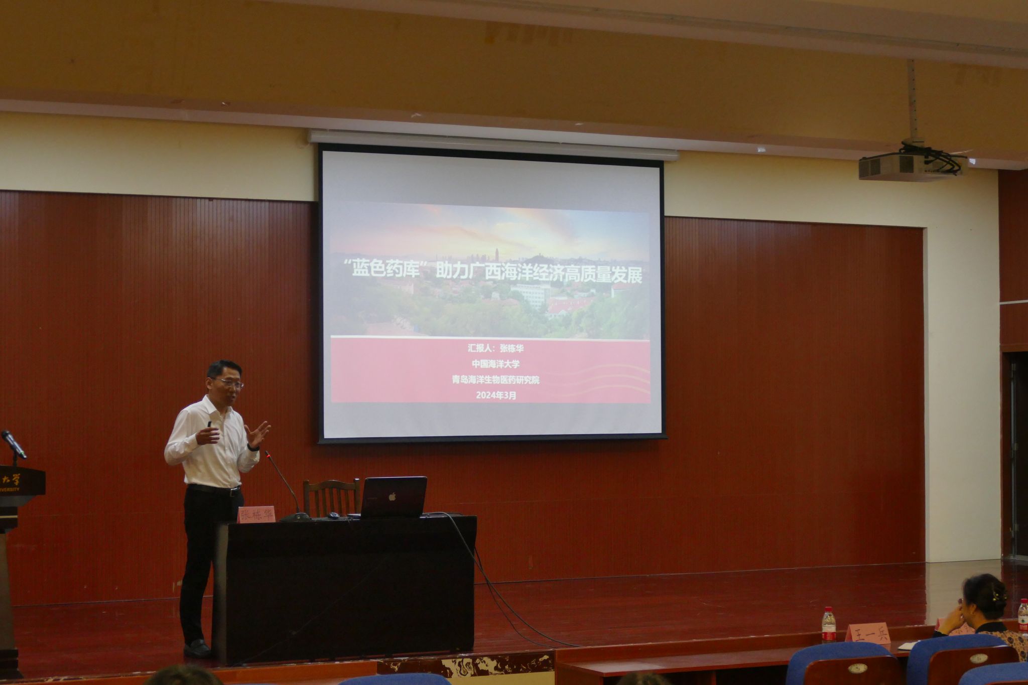 张栋华教授作“‘蓝色药库’助力广西海洋经济高质量发展”的报告,从海洋生物医药概况、国内外发展现状、“蓝色药库”简介、广西发展情况与建议四个方面对海洋生物医药产业发展做了深入讲解,使我院师生对于海洋生物医药产业有了一定的了解。