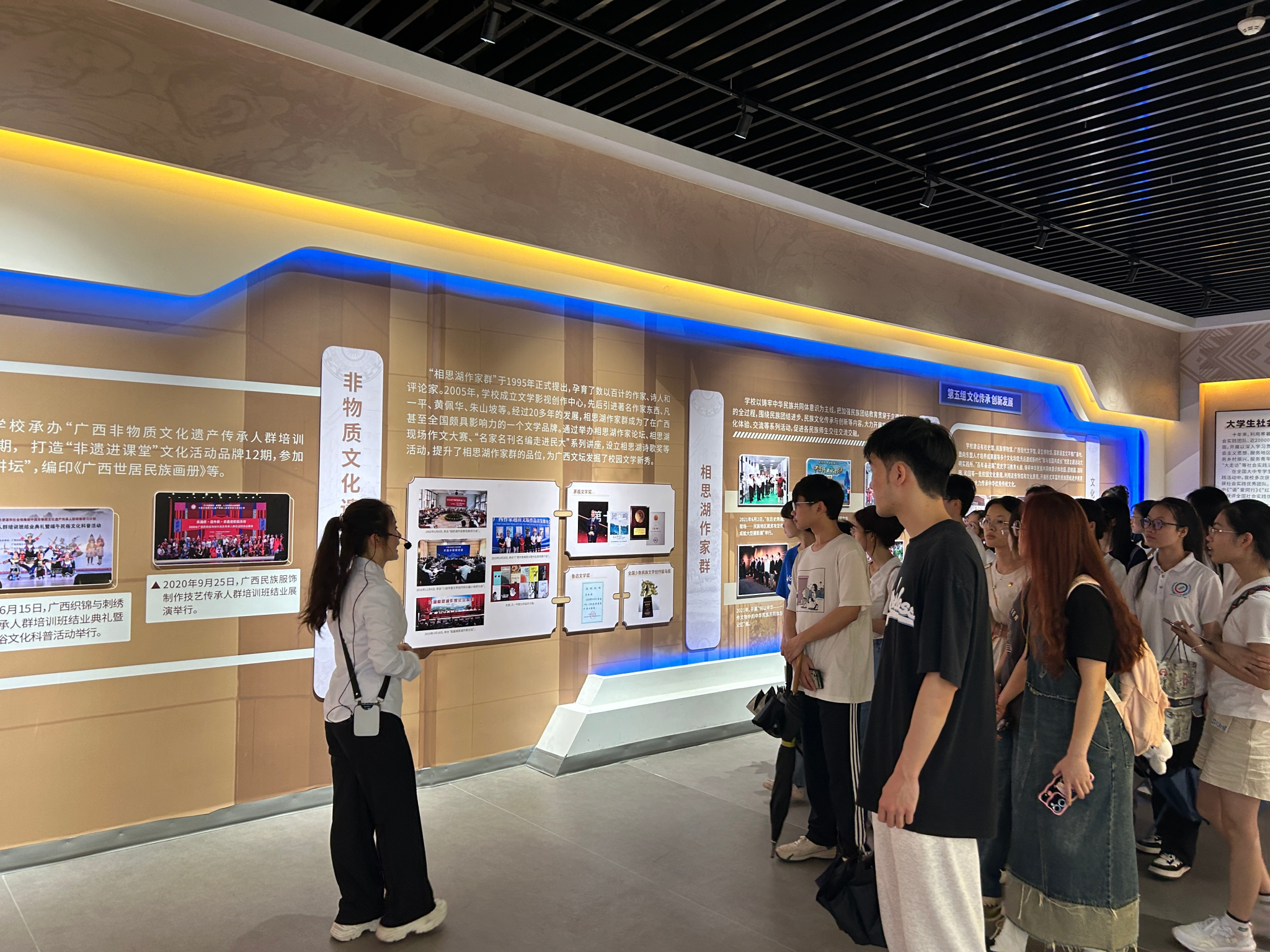 在讲解员的引导下,同志们有序进入校史馆,开始了这次意义非凡的学习之旅。讲解员带领各位同志回顾广西民族大学的建校发展历程,详细解读了领导寄语、历史荣誉等。此外,同志们还深入参观学校各个时期的办学成果展,认真听取学校在教学、科研和对外交流等方面取得的丰硕成果。这些珍贵的成果不仅是学校发展的基石,更是激励着一代又一代民大学子砥砺前行的动力源泉。