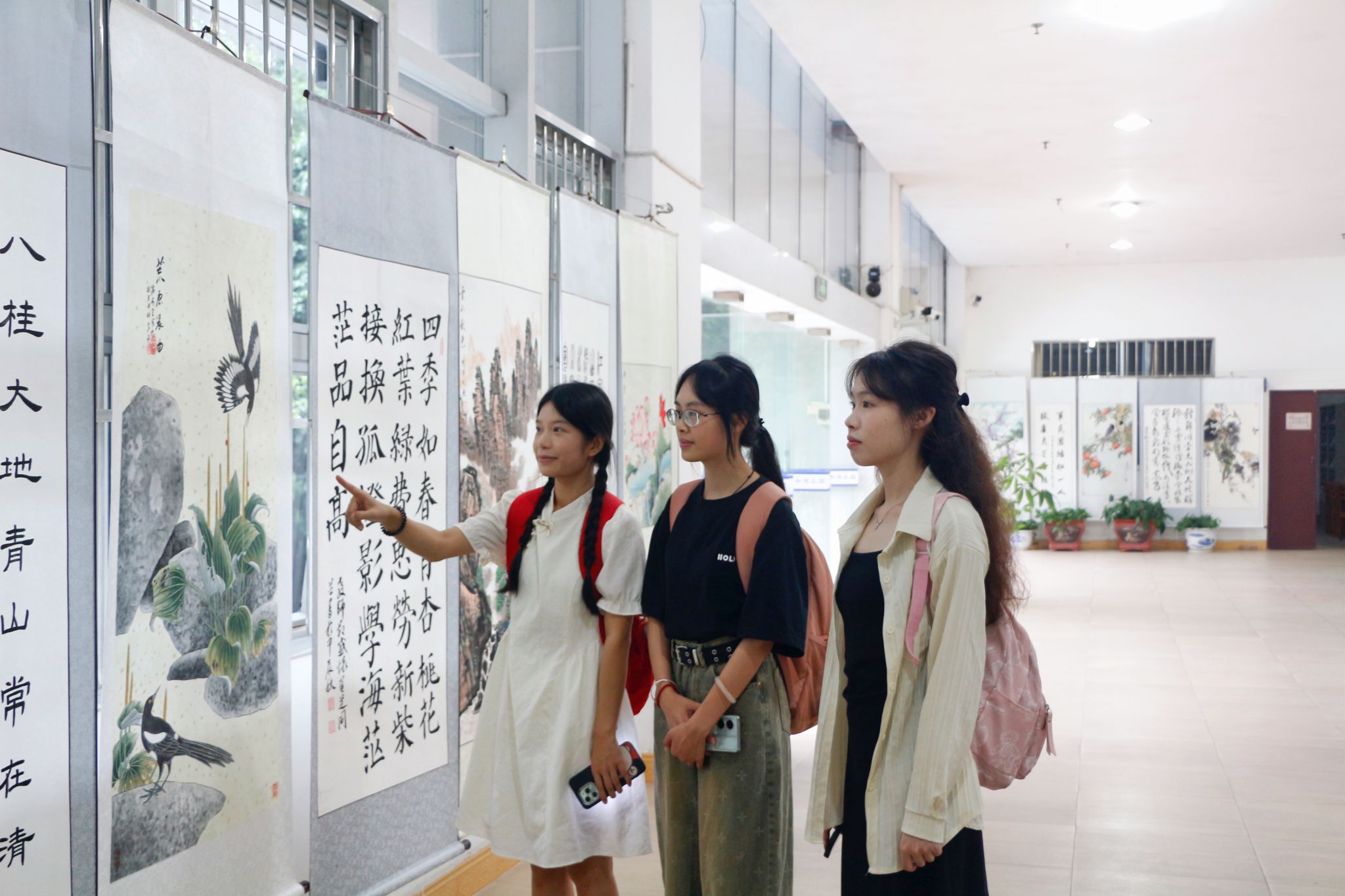 本次展览汇集了风格多样、内涵丰富的艺术作品,包括山水画、花鸟画、书法等。书画家们以笔墨为媒介,以艺术为桥梁,热情讴歌新时代、礼赞新发展、展现新成就,真挚抒发了爱党、爱国、爱人民的深厚感情,展现了书画家们昂扬向上的精神面貌和卓越的艺术风采。同学们沉浸在书画的世界里,每一幅作品都触动着他们的心弦,细细品味着墨香与色彩交织的韵味。本次展览营造了浓厚的文化氛围,充分展示了新时代高校美育之美。