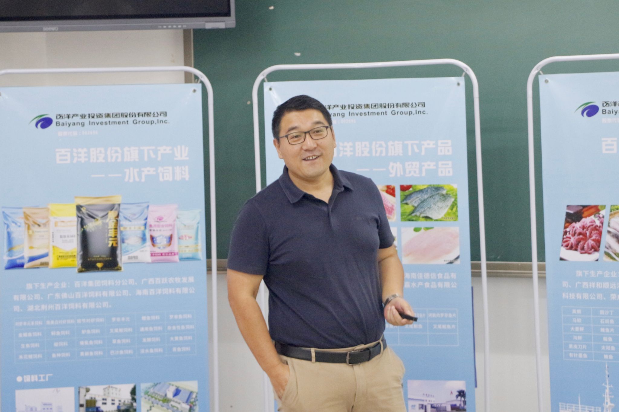 会上,石国中向同学们介绍了百洋集团股份有限公司概况、发展资质、校招要求,他就主要产业方面重点介绍了精深加工产品的种类、销售方向、品质要求等,提出菜品工业化新概念,并由合作目标向同学们阐述、分析水产品精深加工产业未来的发展方向。