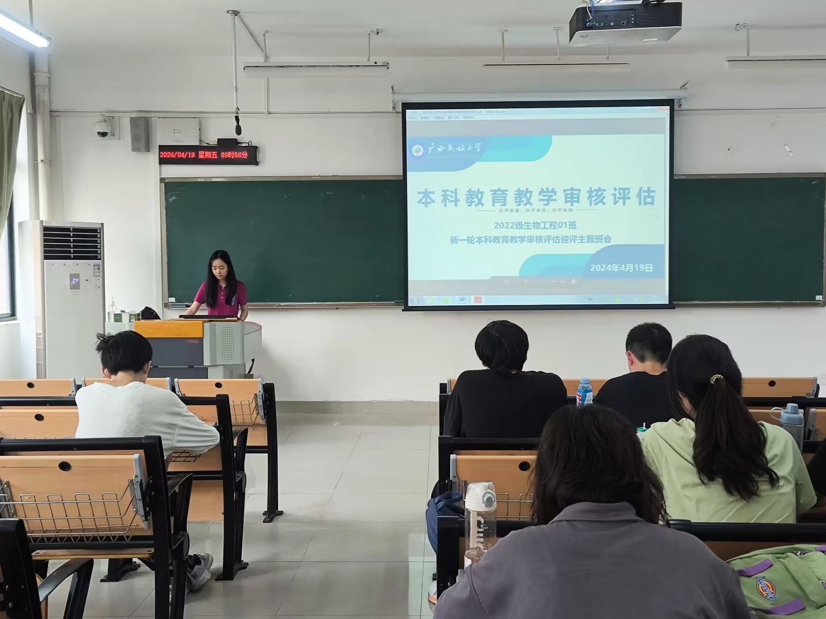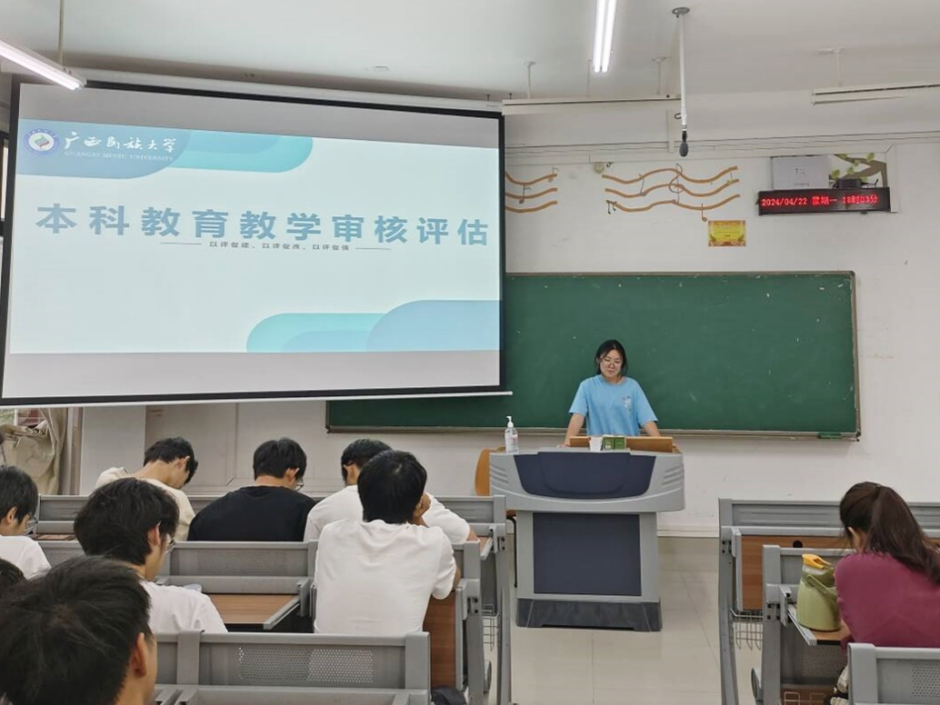 班会上,各班领学人通过PPT演示深入讲解本科教育教学审核评估的具体内容、重点事项以及常见问题;组织学生学习《广西民族大学本科教育教学评估手册知识》,填写在校生学习体验问卷,收集他们对教育教学过程中的体验反馈;组织学生参加本科教育教学审核评估知识竞赛;领学人带领同学们学习本科教育教学审核评估倡议书的内容,不断提高本科教育教学审核评估的思想认识,动员全体同学积极参与到迎评工作中来。