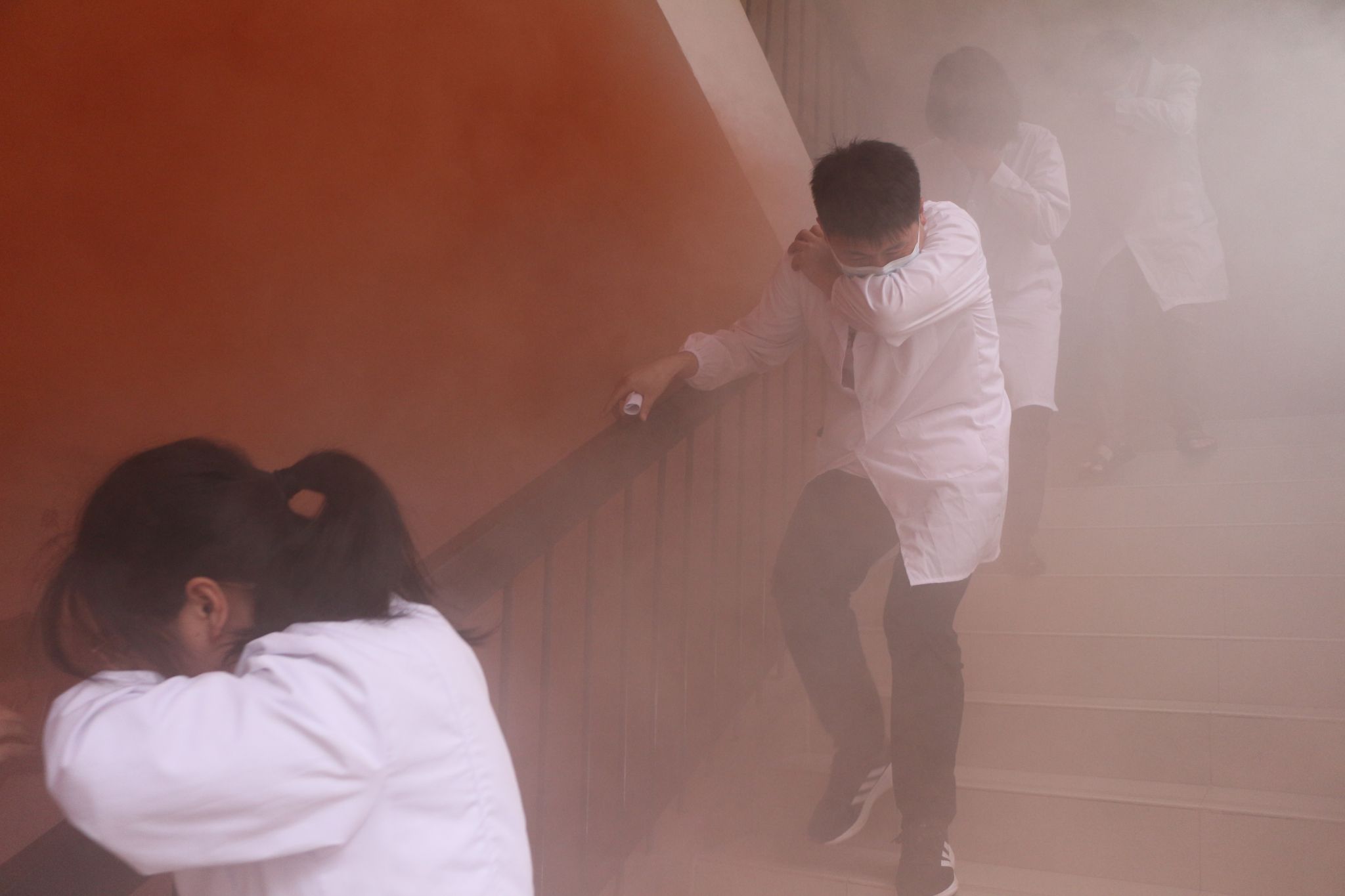在应急疏散演练活动中,演练假设学生在扬帆楼二楼上实验课期间,突发火灾,火势迅速蔓延,浓烟四起,直接威胁到学生的生命安全并造成难以估量的财产损失。随着警报声响起,学生们在教师们的引导下,根据应急指示灯指引,用手肘的衣袖遮住口鼻,采取扶墙、弯腰低蹲的姿势快速离开现场。整个演练过程中,我院学子保持冷静,行动迅速、有条不紊地按照疏散路线撤离至指定的安全区域,充分展示了他们出色的应急反应能力。